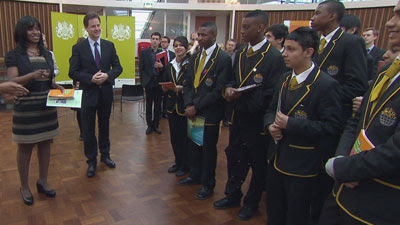 The girl to the right of Gove markedly resembles him, and it does look like a predominantly white school despite the dominant position of the black girl on Gove's right.